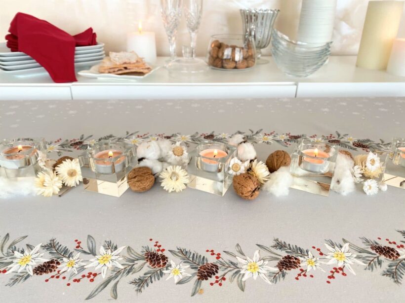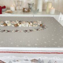 Nappe de Noël imprimée 100% coton, motif placé. Ce modèle est disponible en plusieurs tailles, en coton ou en coton enduit.